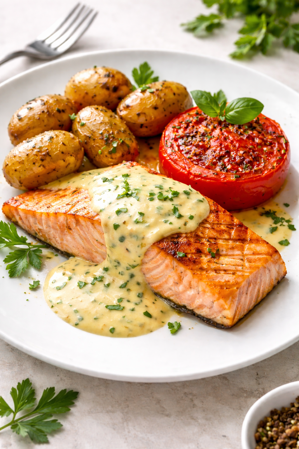 6. 200g Roasted pork belly with garlic, spinach and potato dumplings 150,-