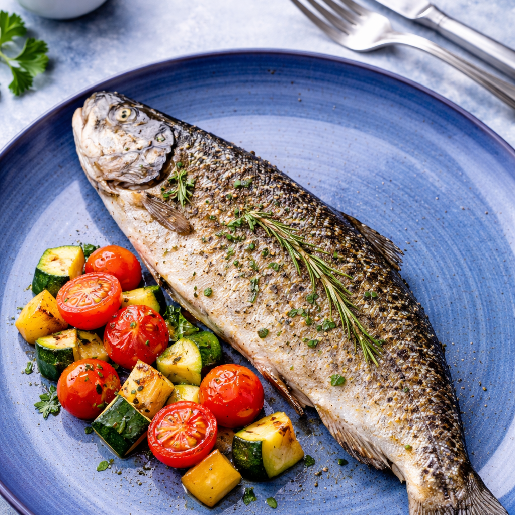 6. 300g Grilled vegetable salad with bell peppers, zucchini, eggplant, onions and tofu, Italian bread 145,-